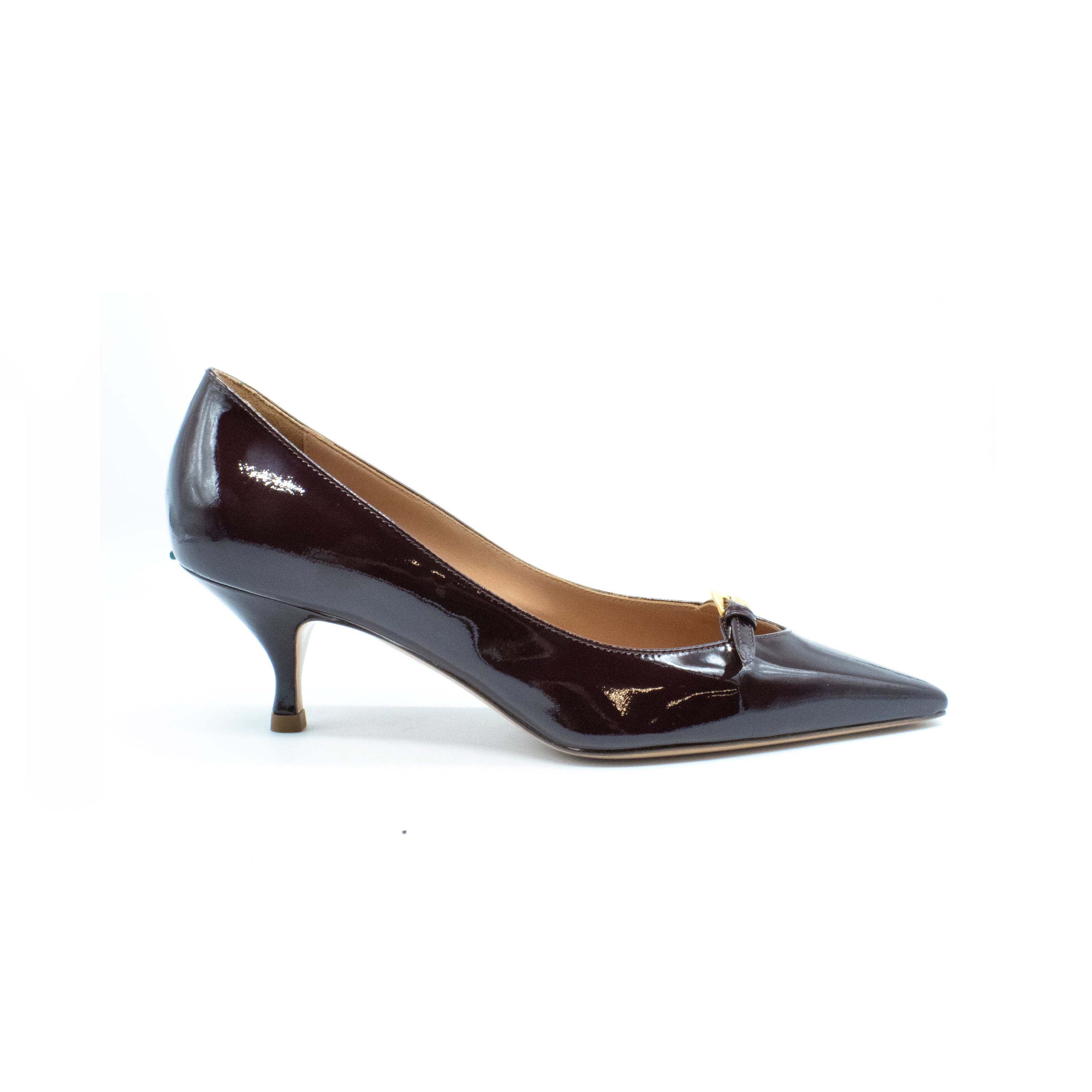Pump dalla linea iper femminile, realizzata in pelle di vitello verniciata color brunello. Il profondo scollo a V è impreziosito da un cinturino con fibbietta a cuore dorata. Forma a punta e tacco a coda.