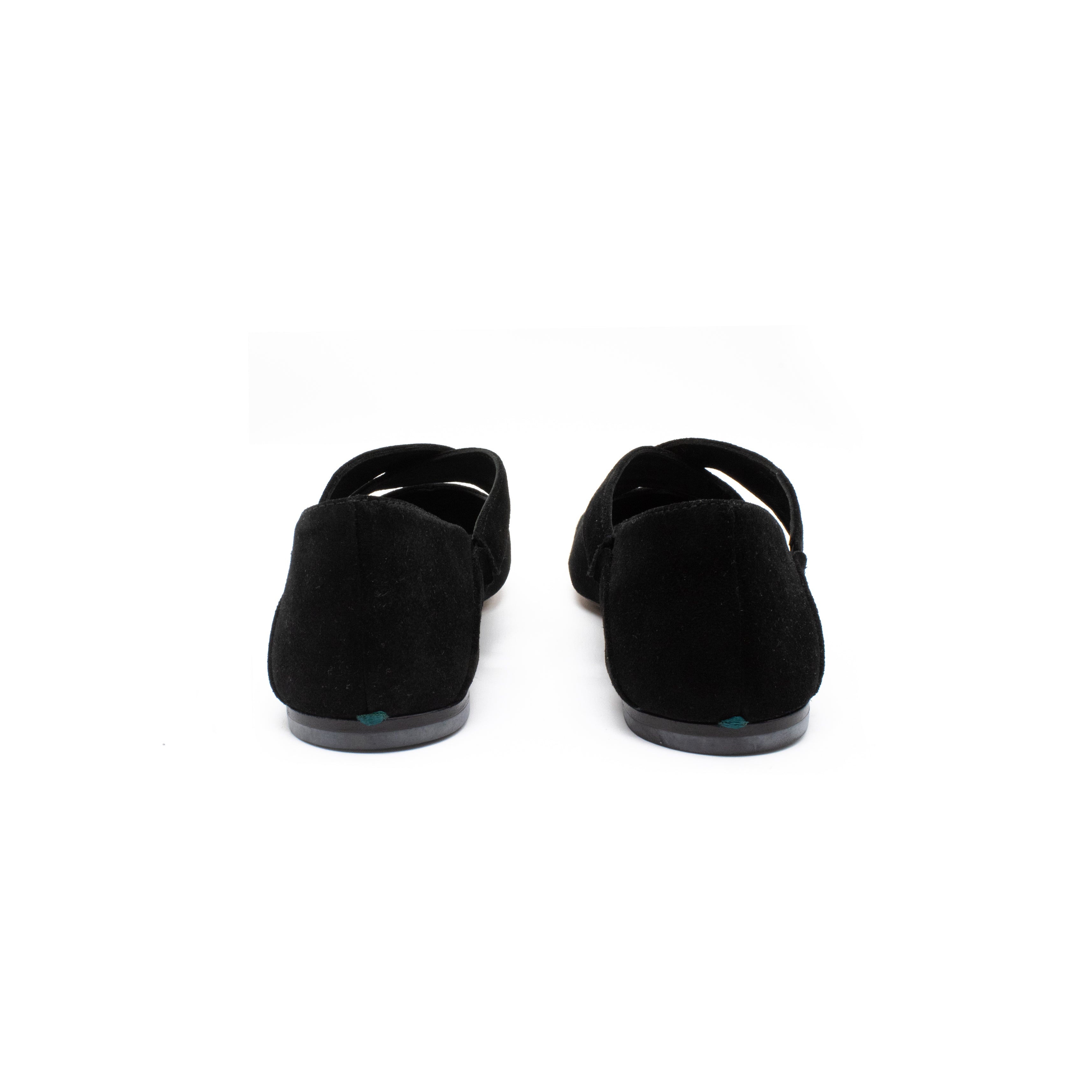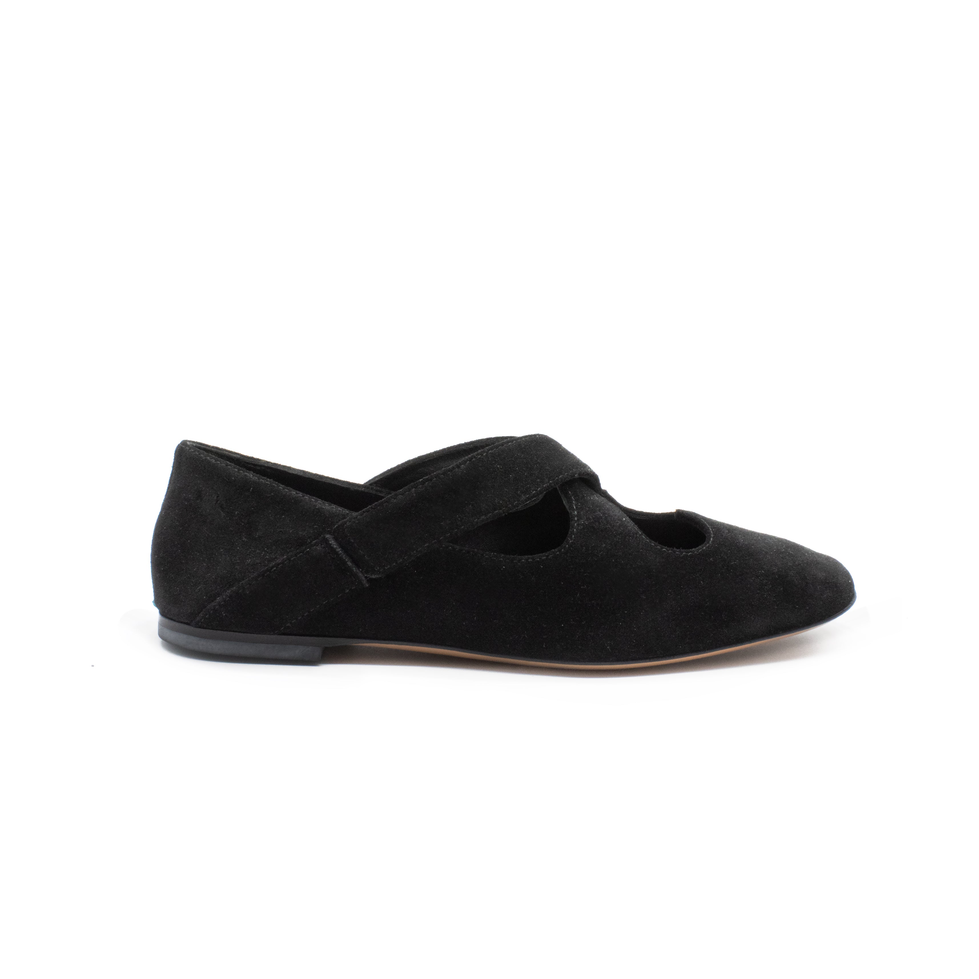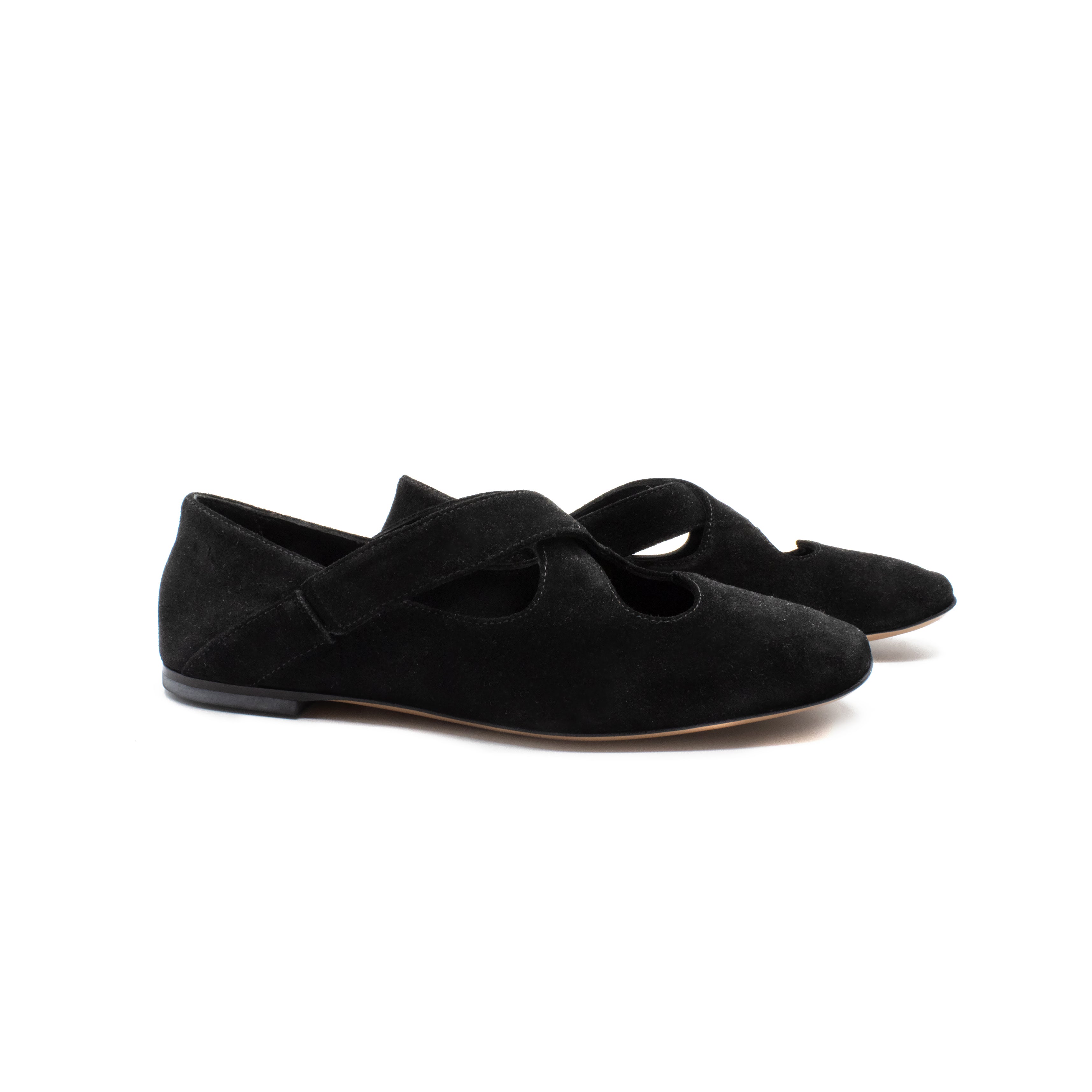 Ballerina realizzata in crosta color nero. La costruzione a sacchetto conferisce morbidezza e comfort alla scarpa. Forma quadrata, scollo a cuore e cinturini che incrociano sul collo del piede, con elastico invisibile per permettere alla calzatura di adattarsi al piede.