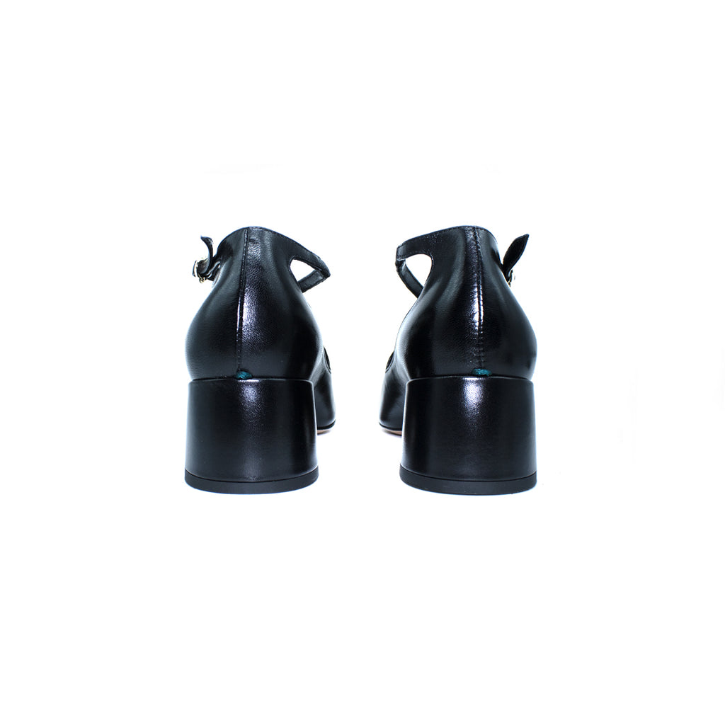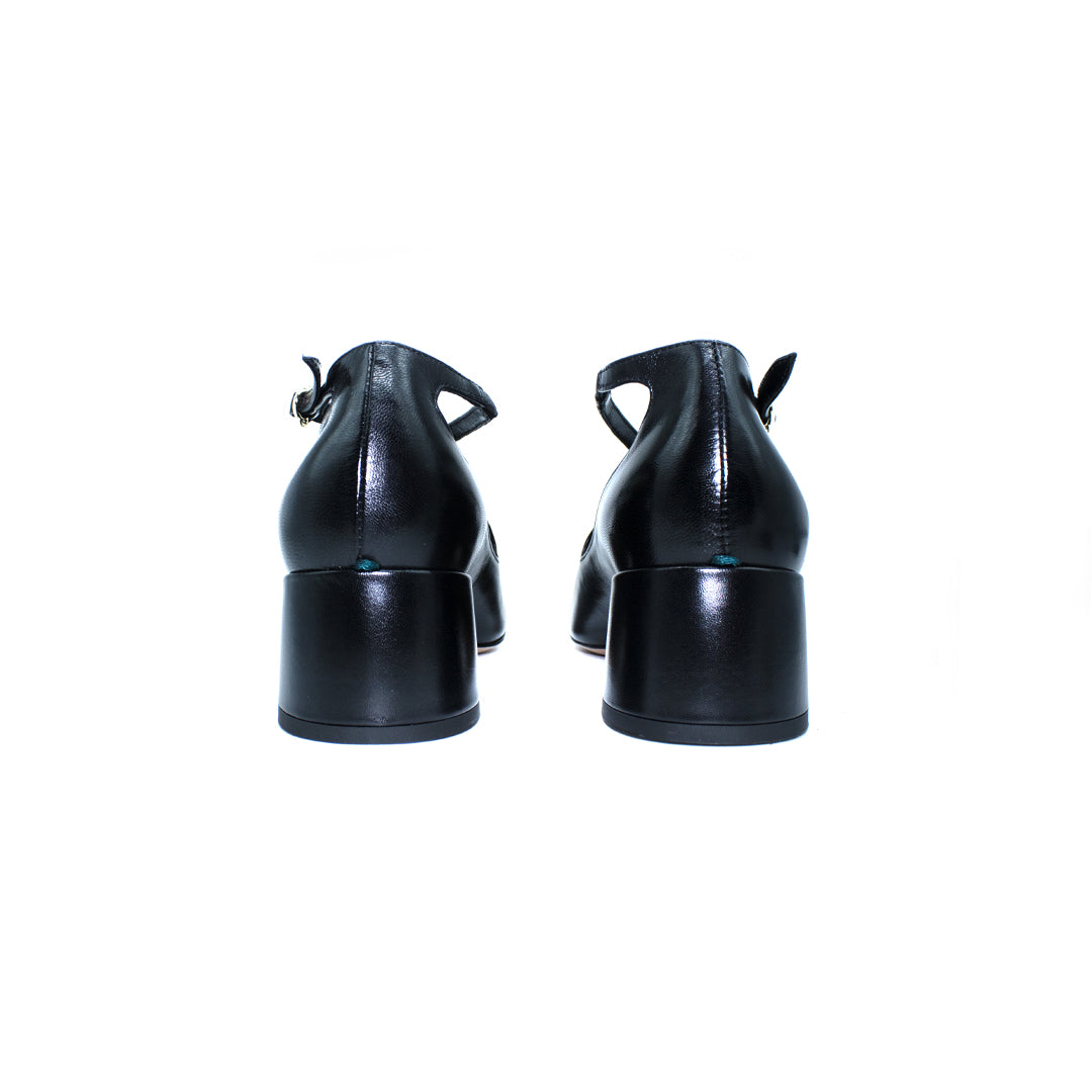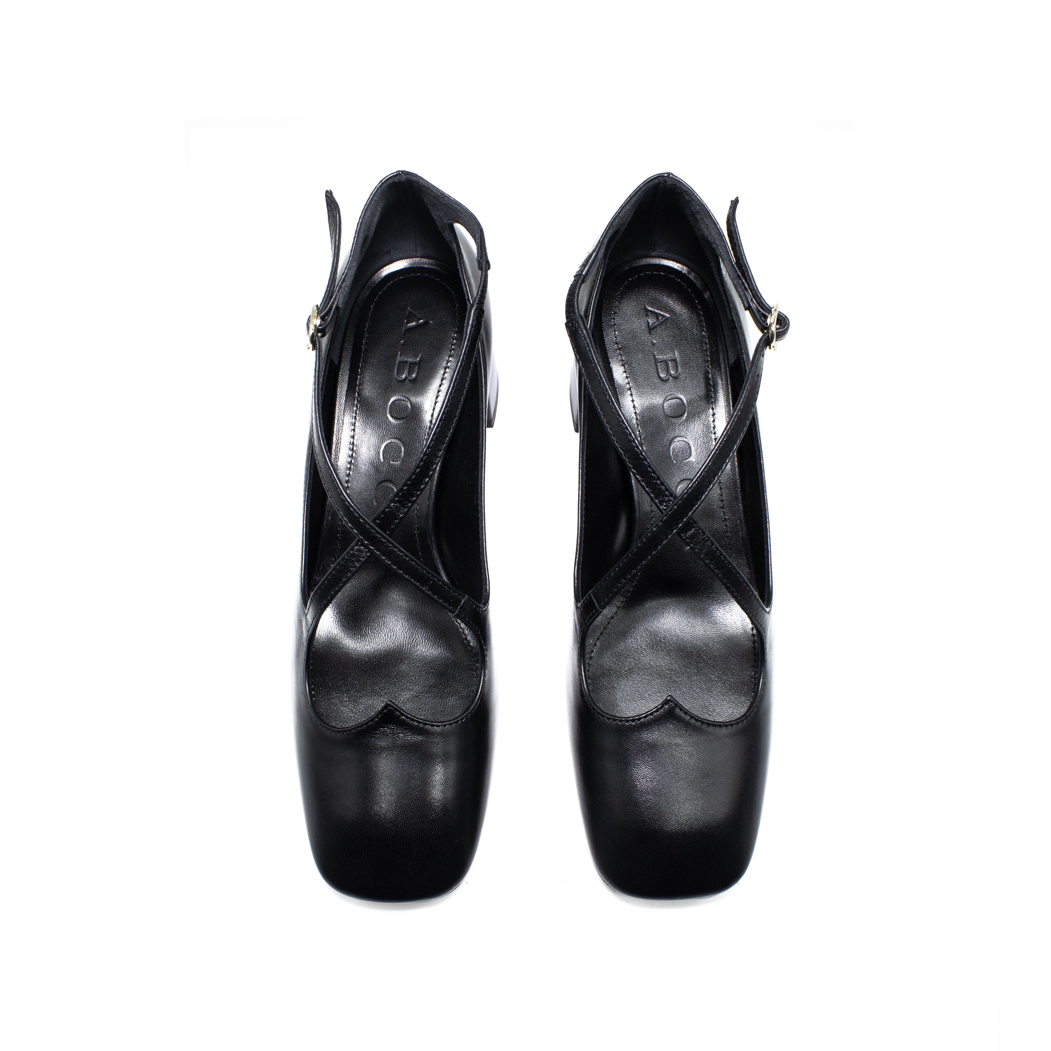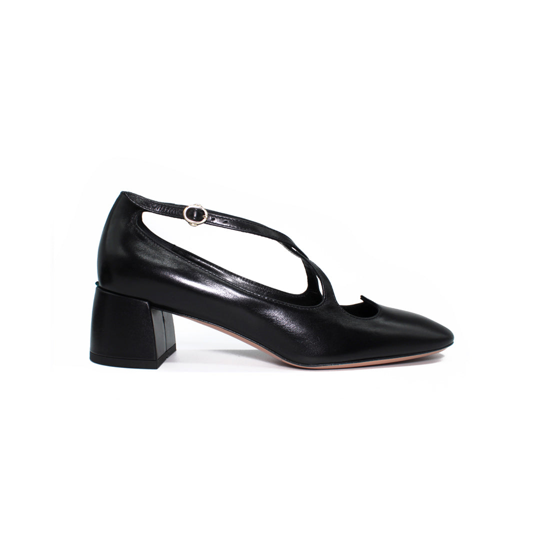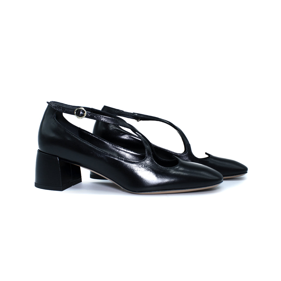 Criss-cross pump realizzata in pelle di capretto color nero. Forma quadrata, scollo a cuore, tacco basato e cinturini che incrociano sul collo del piede.