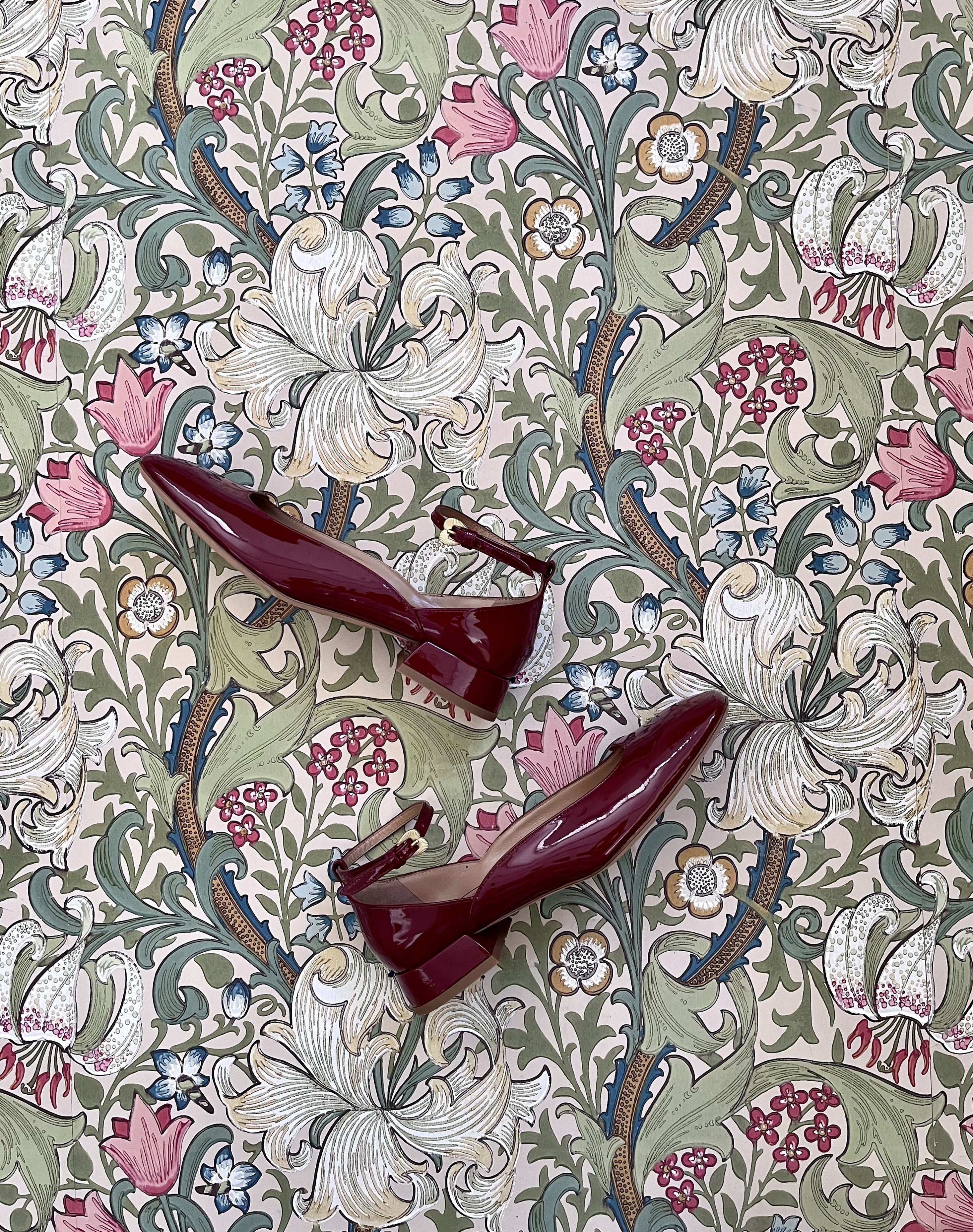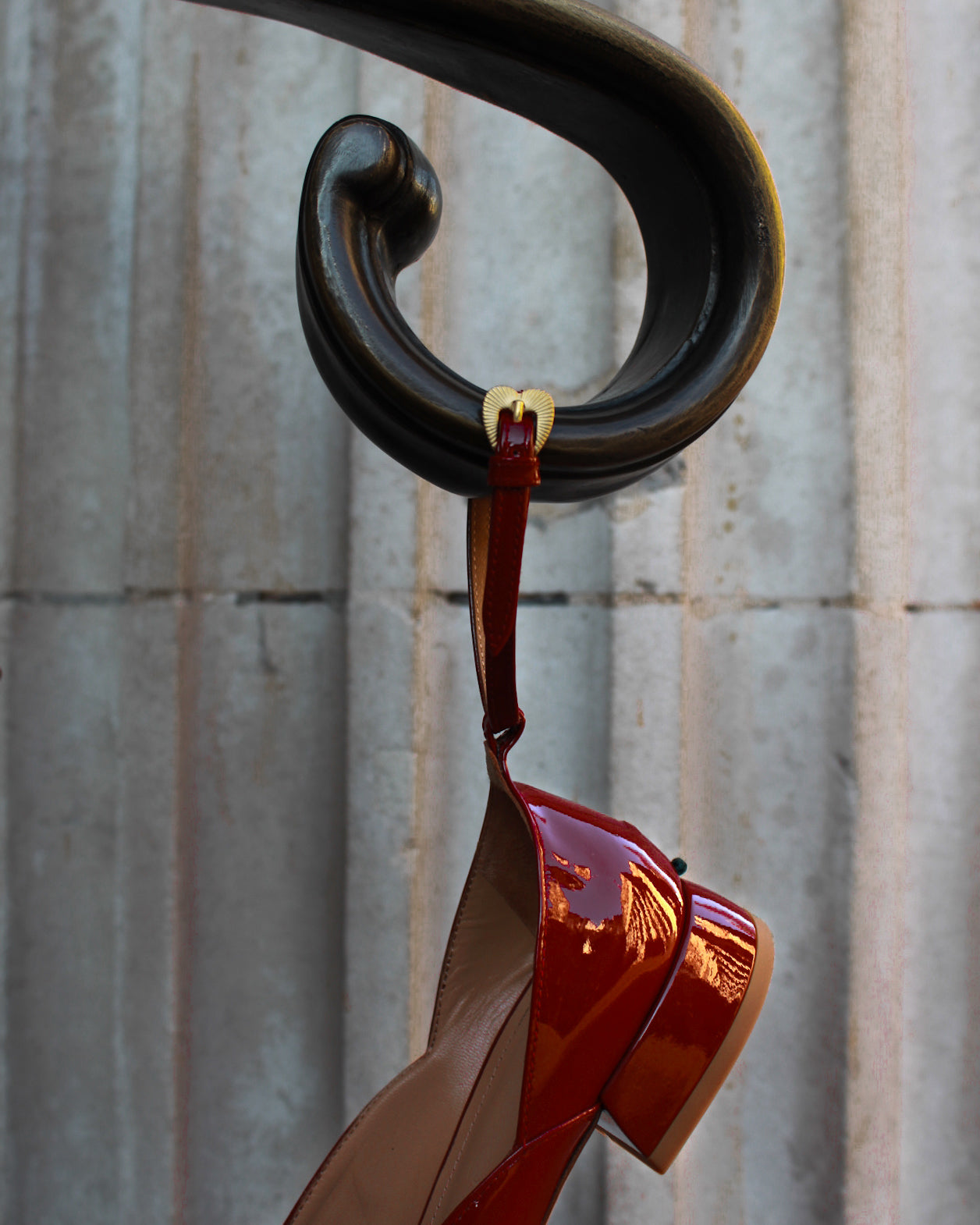 Pump with adjustable ankle strap and heart buckle, made of patent calfskin in Campari color. Heart line on the neckline, square shape and low heel.