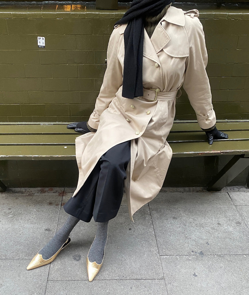 Slingbacks made of calfskin with a crackled gold foil. They feature a pointed toe, sweetheart neckline, and a pointed heel. Adjustable strap at the back with a gold buckle.
