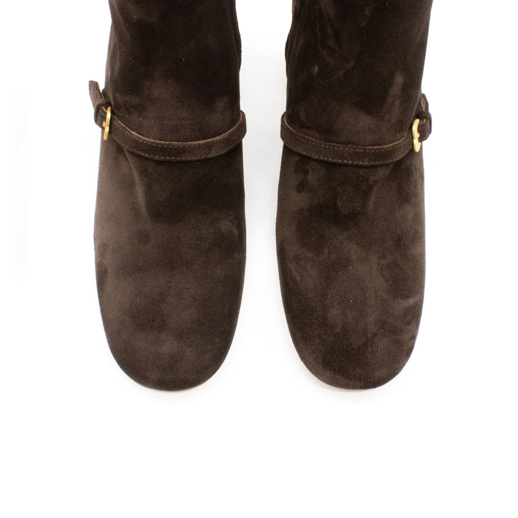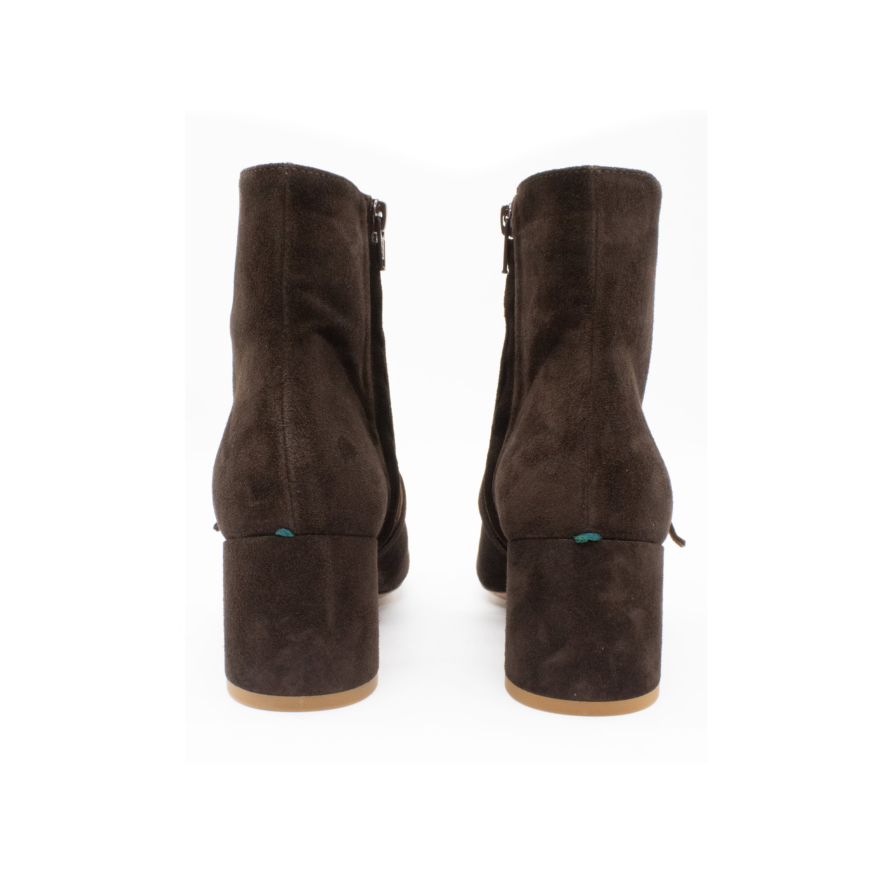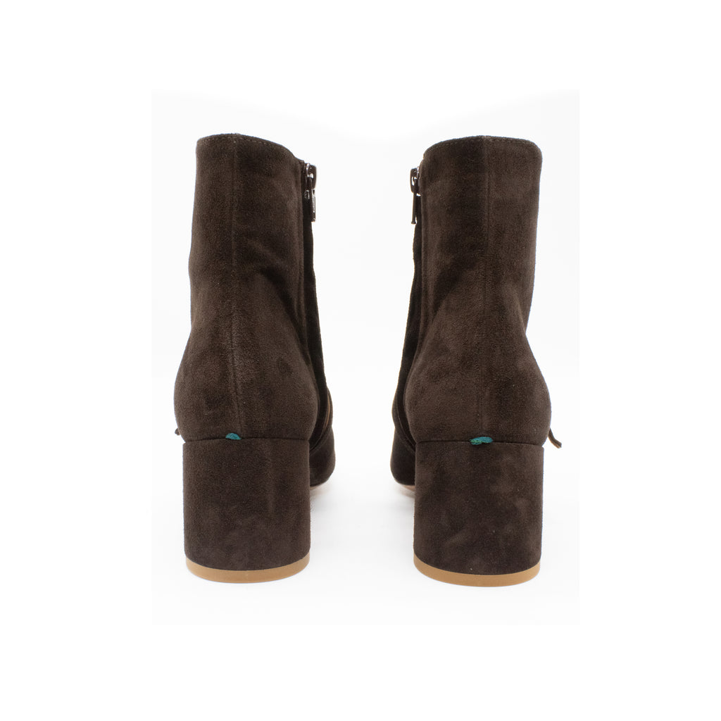 Ankle boot made of dark brown split leather, with a thin strap and a gold heart-shaped buckle. Internal zip. Rounded shape and a low heel for a stable walk.