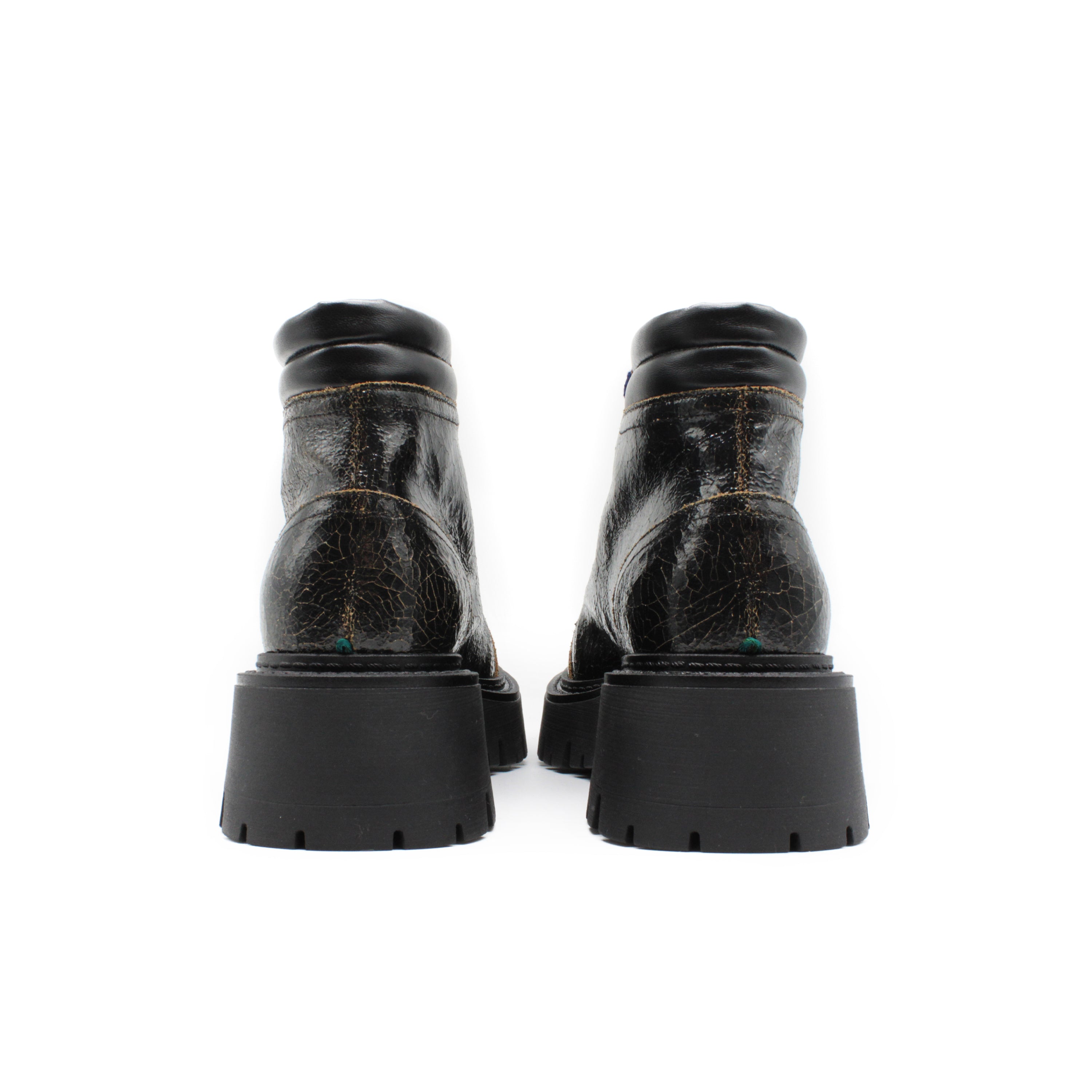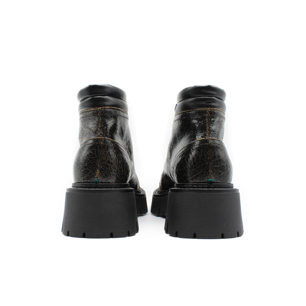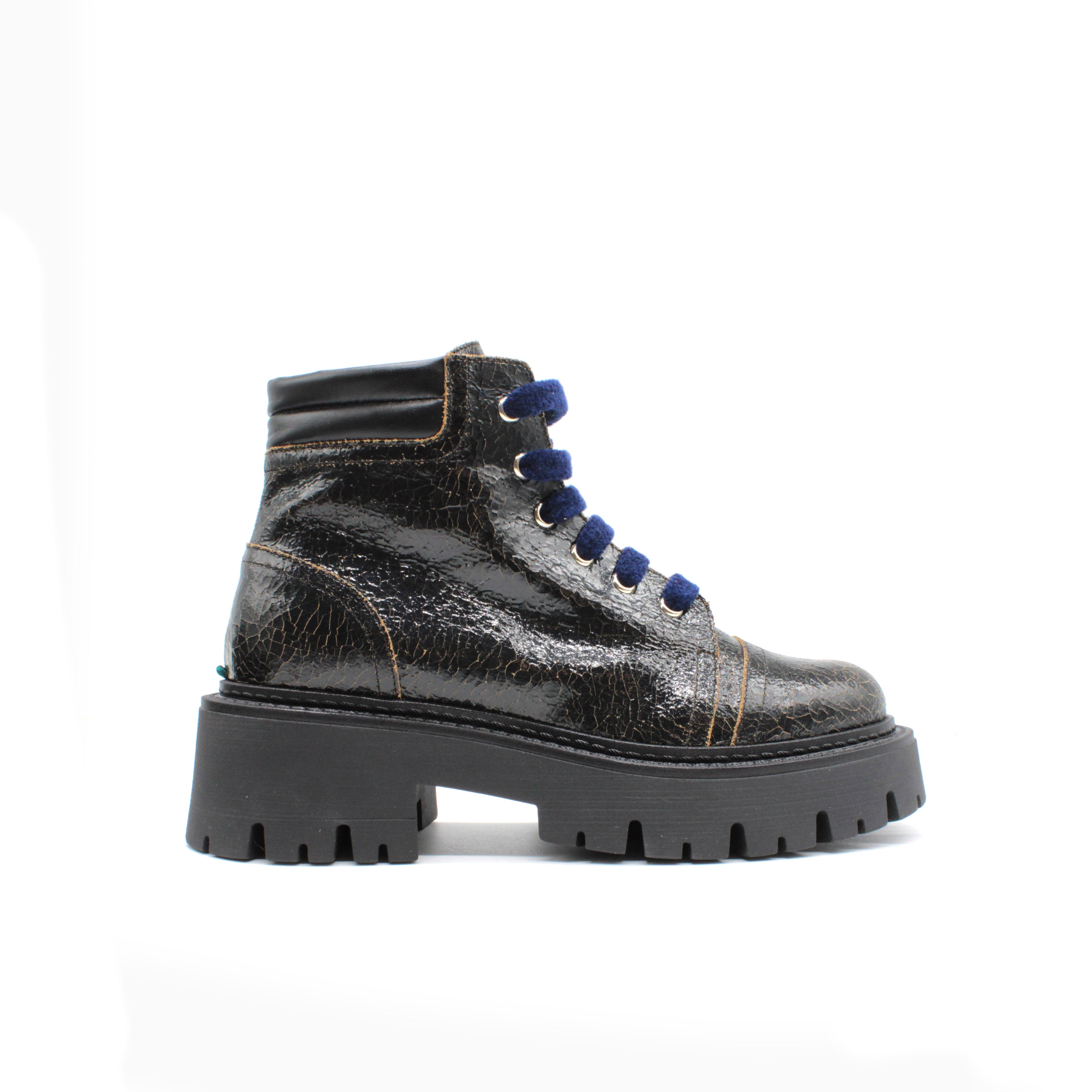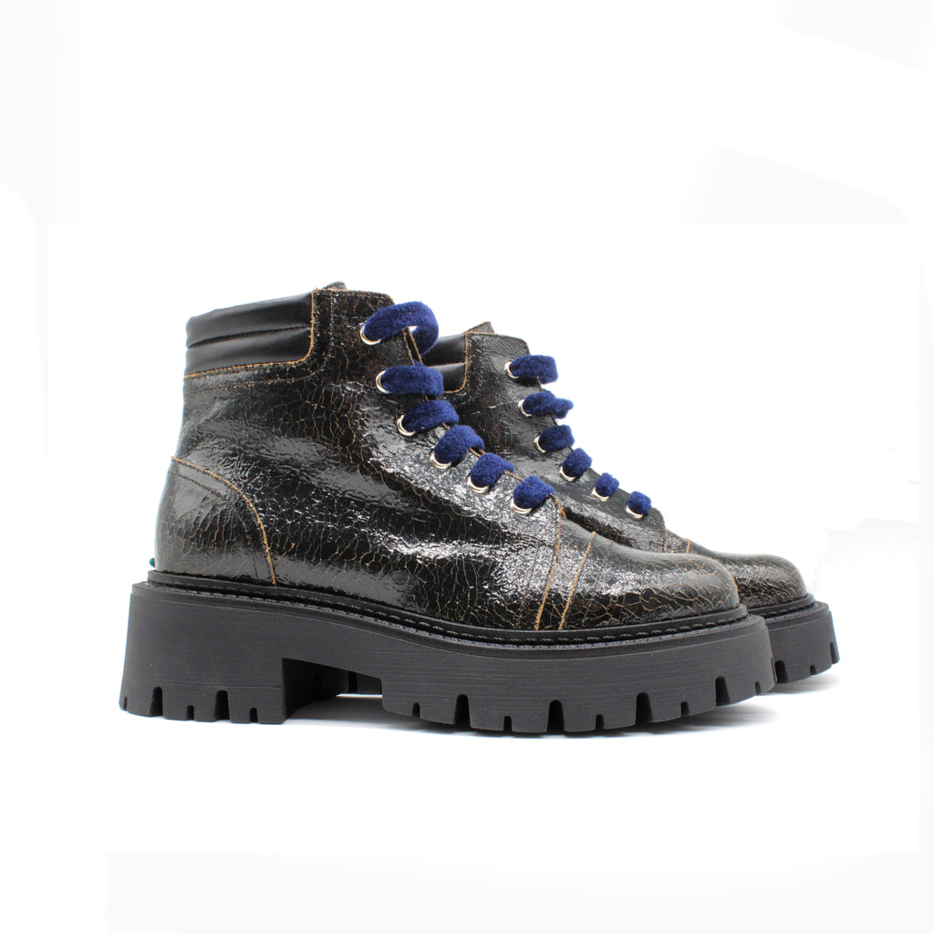 Hiking-style ankle boot made of crackle-effect coated calfskin. A bold design that blends outdoor spirit and urban style. Contrasting chenille laces.
