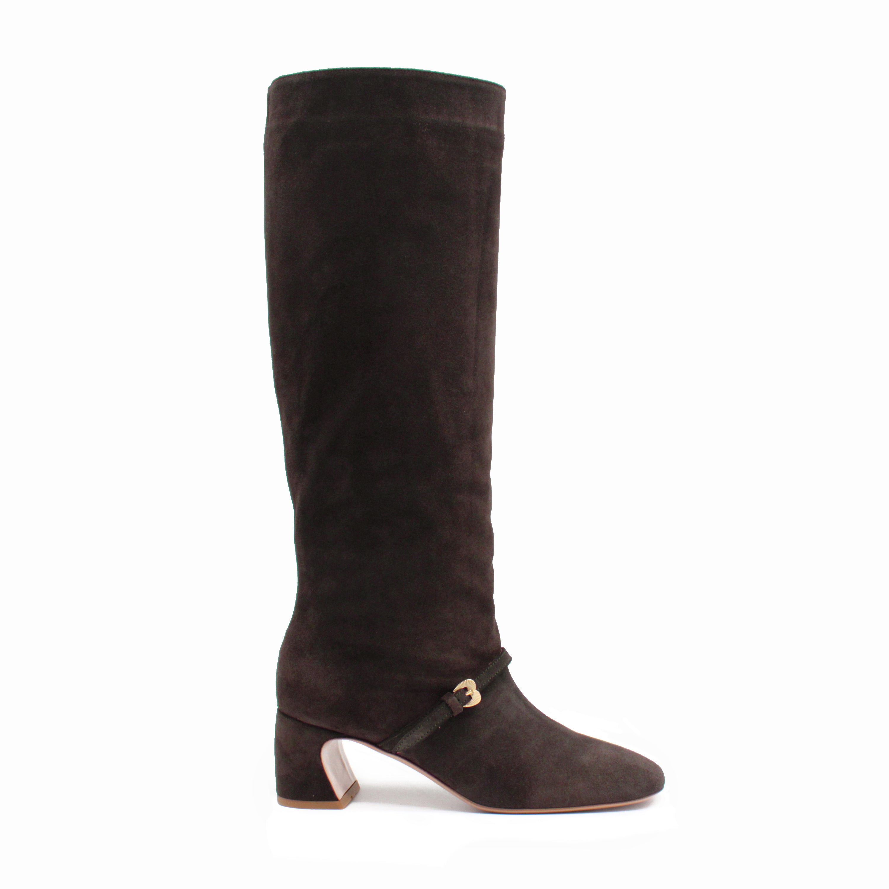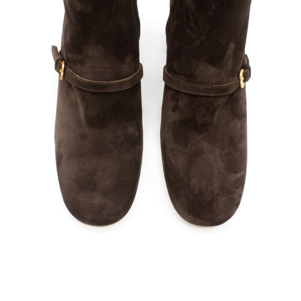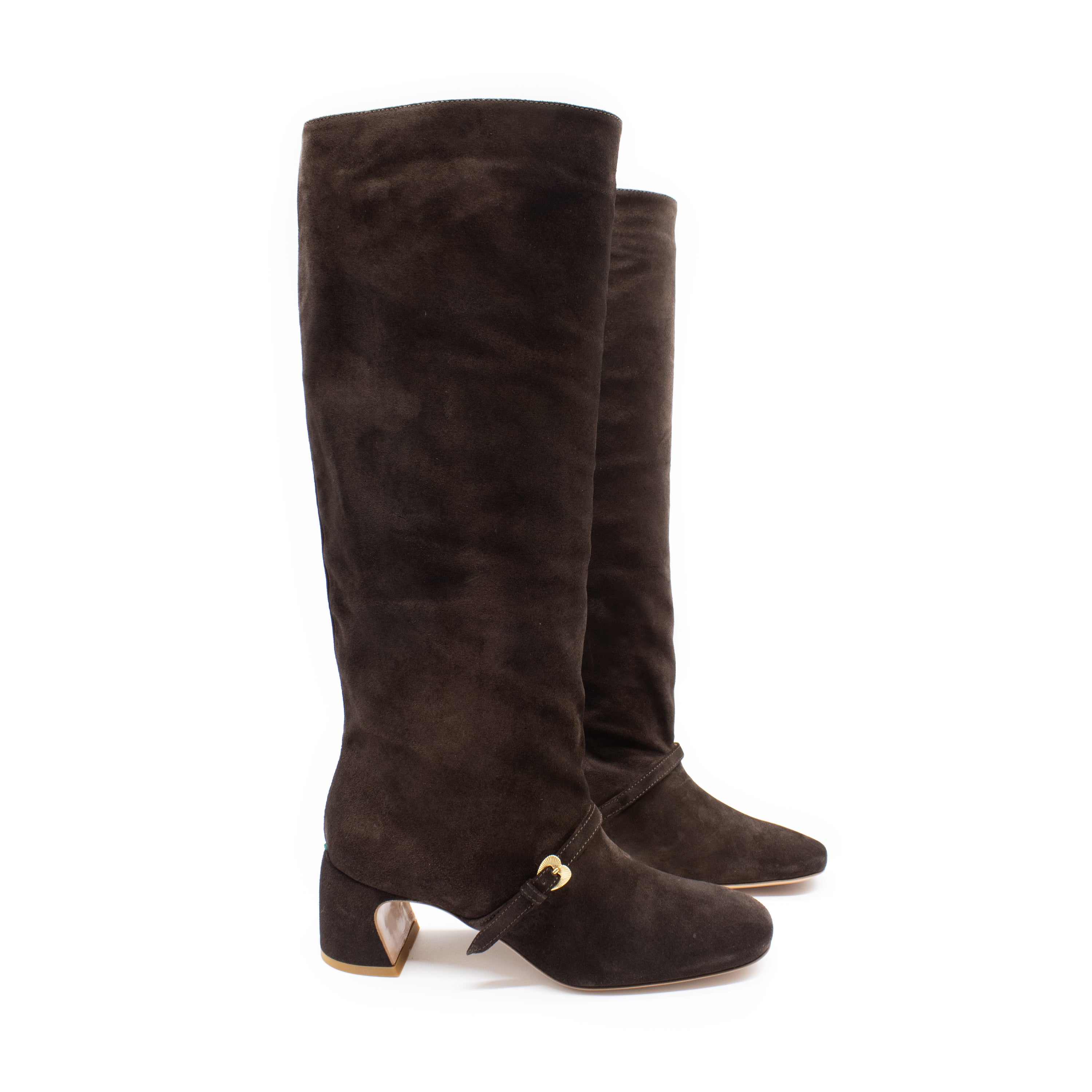 A tube boot made of dark brown split leather, featuring a thin strap and a gold heart-shaped buckle. A rounded shape and a low heel ensure a stable walk.