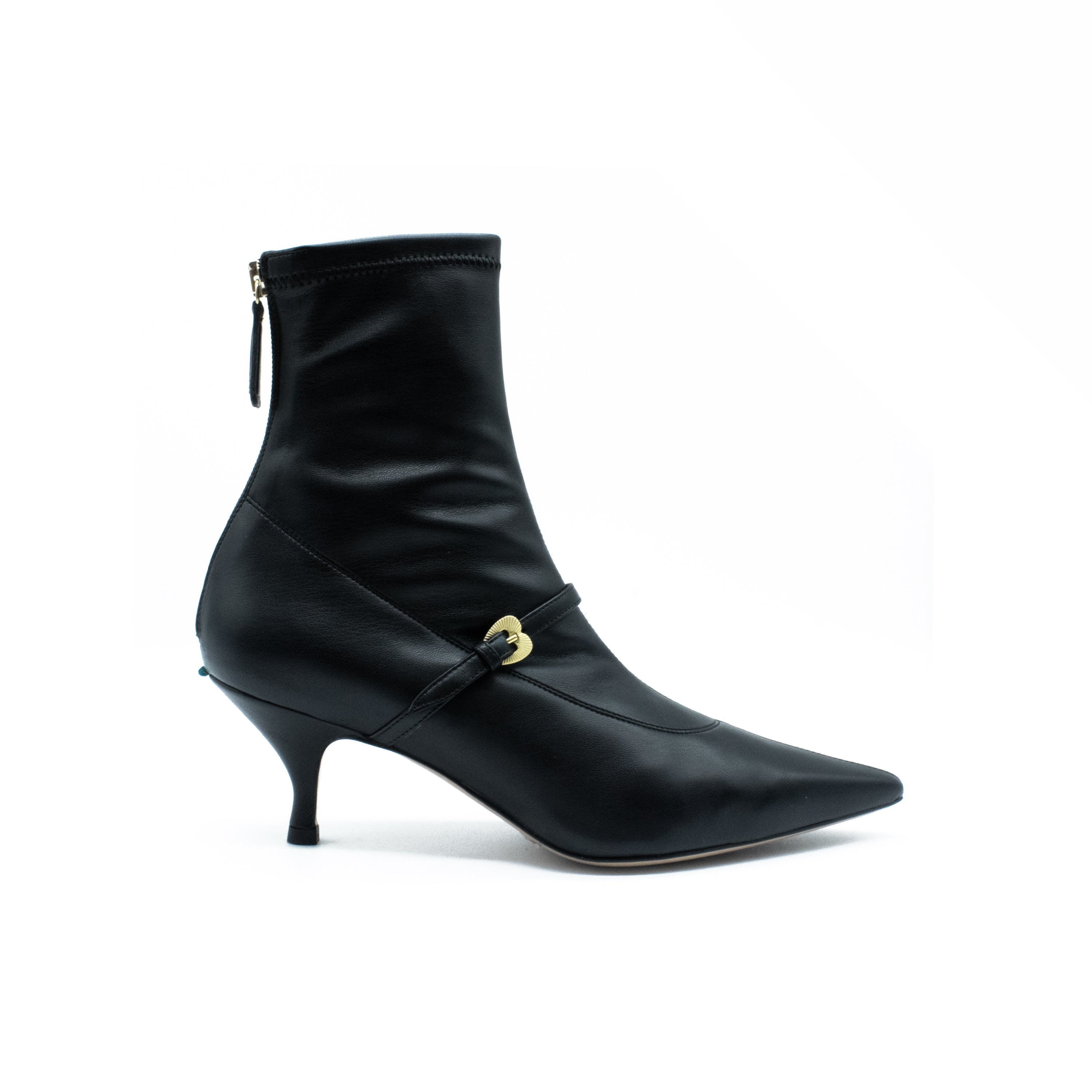 Bottines confortables et ajustées, confectionnées en cuir nappa écologique extensible, avec une fine bride et une boucle dorée en forme de cœur. La fermeture éclair à l'arrière facilite l'enfilage. Bout et talon pointus.