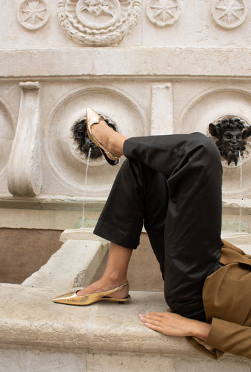 Slingback realizzata in pelle di vitello con lamina dorata effetto cracklè. Forma a punta con scollo a cuore e tacco a coda. Cinturino regolabile sul retro con fibbietta dorata.